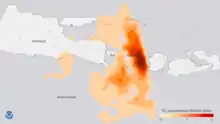 Sunday 26 November's eruption continued at a constant rate,[26] and lahars were reported in the Selat district south of the volcano.[24] The Australian Government's Bureau of Meteorology reported that the top of the eruption column had reached an altitude of 9,144 m (5.7 miles).[27] Ash continued to spread in a southeasterly direction, and estimates by the Pacific Disaster Center predicted that the resulting atmospheric ash exposure would affect up to 5.6 million people within the densely populated region surrounding the volcano.[26]