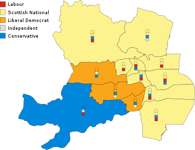 The Scottish National Party won 19 seats, the Scottish Conservatives won 11, Scottish Labour won nine, the Scottish Liberal Democrats won four and there were two independent members. On 11 May, the Lib Dems, ruled out entering into a formal coalition and instead would "consider every issue before the council on its merits on a case-by-case basis."[1]