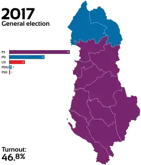 The previous parliamentary elections were held on 23 June 2013 and resulted in a victory for the Socialist Party of Albania-led Alliance for a European Albania, which received 57.6% of the vote, winning 83 of the 140 seats. The opposition Alliance for Employment, Prosperity and Integration headed by Lulzim Basha of the Democratic Party received almost 39.5% of the vote and won the other 57 seats. The Socialist Party led by Edi Rama formed the government with Rama as Prime Minister.