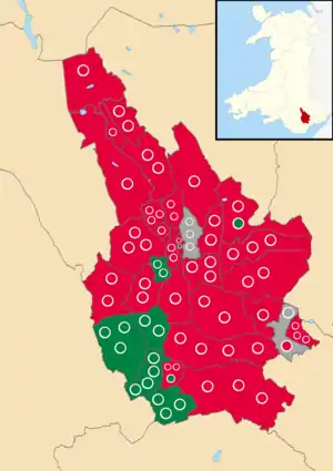 ![]() Map showing the results of the 2017 Caerphilly County Borough Council election. Red showing Welsh Labour, Green showing Plaid Cymru & grey showing independent candidates. | |||||||||||||||||||||||||||||||||||||||||||||||
