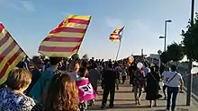 Protesters also sought to maintain momentum from the referendum. Some wore the Estelada (separatist flag) in yellow, red, and blue.[3] Crowds sang Catalan singer Lluís Llach's "L'Estaca" and the Catalan anthem, "Els Segadors".[10] On the Via Laietana, they chanted "Withdraw the forces of occupation" and "The disgrace of Europe" to the tune of the rock song "Seven Nation Army".[14]