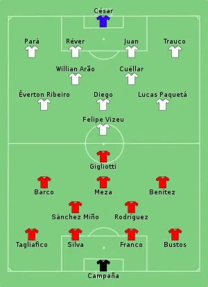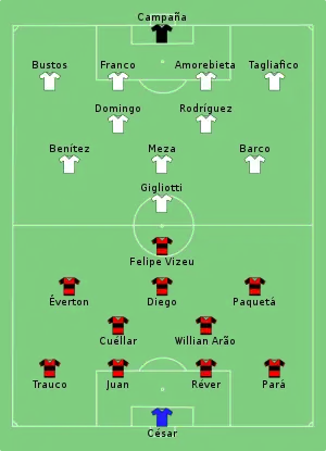 Flamengo scored after eight minutes when Réver headed a free kick from Trauco. Independiente equalized through Emmanuel Gigliotti, who combined with Benitez and finished a counter attack. Seven minutes after halftime, Barco crossed from the left side and Maximiliano Meza scored the winning goal with a right-footed volley.[6]