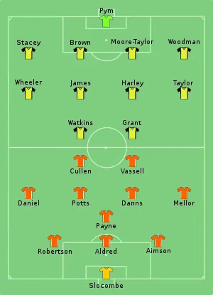 Watkins had been voted the EFL Young Player of the Season at the EFL Awards.[14] Blackpool adopted a 3–5–2 formation while Exeter played as a 4–4–2.[14] Exeter played in luminous yellow shirts, shorts and socks, while Blackpool's kit was tangerine and white shirts, white shorts and tangerine socks.[12]