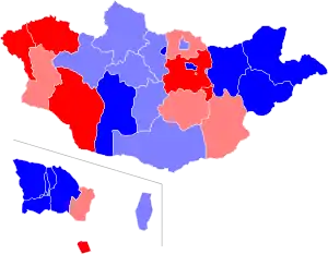 ![]() Second round results. Blue denotes provinces and Ulaanbaatar districts won by Battulga and red denotes those won by Enkhbold. Darker shades represent a majority (more than half), lighter shades represent pluralities. | |||||||||||||||||
