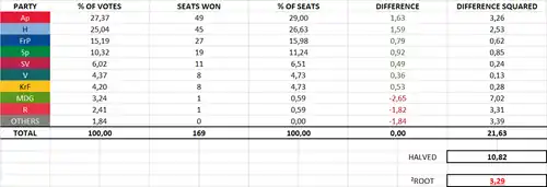 150 of the seats are regular district seats. These are awarded based on the election results in each county, and are unaffected by results in other counties. Nineteen of the seats (one for each county) are leveling seats, awarded to parties who win fewer seats than their share of the national popular vote otherwise entitles them to. A modification of the Sainte-Lague method, where the first quotient for each party is calculated using a divisor of 1.4 instead of 1, is used to allocate both the constituency and leveling seats. A party must win 4% of the popular vote in order to win compensation seats, but may still win district seats even if it fails to reach this threshold. The system for apportioning seats is biased in favour of rural areas since the area of the county is a factor, but the system of compensation seats reduces the effect this has on final party strength.[5]