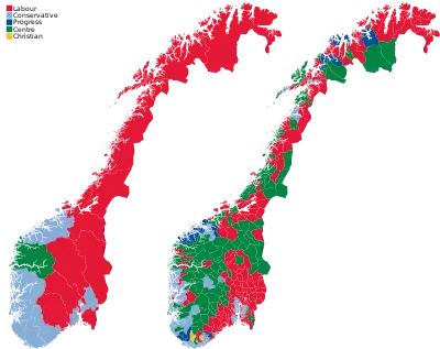 A parliamentary election was held in Norway on 11 September 2017 to elect all 169 members of the unicameral Norwegian Parliament, the Storting. The non-socialist parties retained a reduced majority of 88 seats, allowing Prime Minister Erna Solberg's Conservative-Progress coalition to remain in government.[1][2] The Liberal Party joined the coalition in January 2018 but it remained a minority cabinet until the Christian Democratic Party joined the coalition in 2019. The three largest centre-left parties won 79 seats. The Green Party retained its single seat, while the Red Party won its first ever seat.