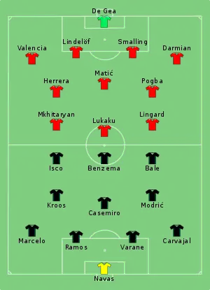 In the 16th minute, Casemiro headed against the bar after a corner from the left-hand side by Toni Kroos, before opening the scoring eight minutes later with a left-footed strike after a pass into the box from Dani Carvajal.[13] Isco made it 2–0 in the 52nd minute when he side-footed the ball into the bottom corner of the net from six yards after a pass from Gareth Bale. In the 61st minute, Bale hit the bar with a shot from the right of the penalty area. Romelu Lukaku pulled a goal back for Manchester United a minute later when he followed up on an initial shot from Nemanja Matić, which was parried back into his path by Keylor Navas.[14]