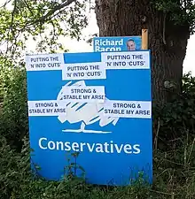 Conservative campaign poster graffitied with anti-conservative stickers - 7 June – Solar, wind and nuclear power each provide more electricity than gas and coal combined for the first time in the UK.[67]