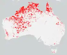 A bushfire, that started on 11 October, approximately 120 km (75 mi) south east of Broome burned through an area of 880,000 ha (2,200,000 acres). Adverse conditions, the remote location and a lack of water meant that the fire was fought using back-burning, constructing fire lines and using aircraft.[16]