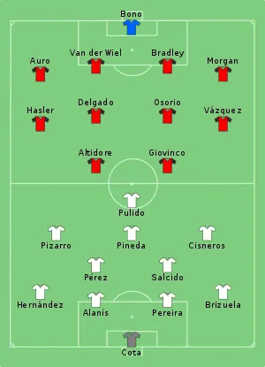 Chivas took the lead in the second minute on a goal scored by Rodolfo Pizarro, during an attack that originated from a throw-in by Isaác Brizuela, who assisted Pizarro's goal.[49] Toronto's Jonathan Osorio scored the equalizing goal in the 19th minute, finishing an attack started by Marky Delgado deep in the midfield. Toronto took control of possession and shooting chances through to halftime, but failed to score after two saves by Chivas's backup goalkeeper Miguel Jiménez.[49][50] During the first half, Toronto's Jozy Altidore vomited several times on the pitch — the cause being a "stomach bug" that several Toronto players reportedly received in the semi-finals against América.[51] Chivas regained partial control of the match in the second half, alternating attacks with Toronto as both teams sought to take the lead.[49][52] Chivas scored the match's winning goal in the 72nd minute on a free kick by Alan Pulido, which was misread by goalkeeper Alex Bono and ended up in the far side of the goal.[3][53] Toronto failed to finish in its later attacks, which also included a no-call penalty for an alleged foul on Sebastian Giovinco.[54][55]