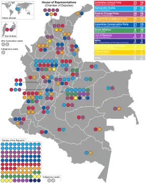 The Chamber of Representatives consisted of 172 members; 162 were elected by proportional representation from 33 multi-member constituencies based on the departments, with seats allocated using the largest remainder method.[1] Two members were elected by the Afro-Colombian community and one by the indigenous community.[2] Although a new constituency had been created for the Raizal minority, legislation had not been approved to allow the election to take place. A further five seats were reserved for FARC and one for the running mate of the runner-up in the presidential election as part of the Colombian peace process.[3][4]