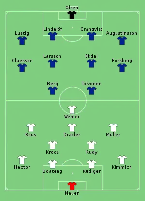 Julian Draxler had a shot blocked from close range before he toe-poked a left-footed effort narrowly wide from a tight angle soon after. Sebastian Rudy left the field with a bloody nose after a collision with Ola Toivonen moments before he burst into the box to control a Viktor Claesson cross on his chest and lift his shot over Manuel Neuer into the far corner of the net. Three minutes into the second half, Germany drew level when Timo Werner's cross found Marco Reus, who met it with his knee and turned the ball into the bottom corner of the net. With just under 10 minutes left, Jérôme Boateng was dismissed after picking up a second yellow card for a tackle on Marcus Berg, and Neuer then made a one-handed save to deny substitute John Guidetti from a downward header.[25] Toni Kroos tapped a free-kick short to Reus before sweeping the return pass into the top right corner from left of the penalty area with his right foot.[26]