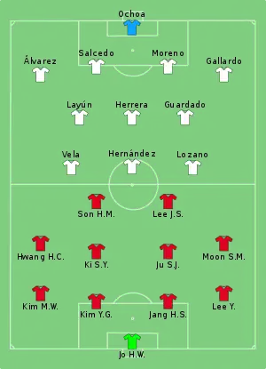 In the 12th minute, Hirving Lozano made a block to deny Lee Yong. Nine minutes later, Son Heung-min shot a low drive which Héctor Moreno helped to keep out. Jang Hyun-soo handled Andrés Guardado's cross and the referee awarded a penalty, Carlos Vela stepped up and sent Jo Hyeon-woo the wrong way. Two minutes later, Miguel Layún lashed his effort over from close range. South Korea wanted a penalty of their own after the restart when Moon Seon-min's strike clipped Carlos Salcedo's arm, but the referee waved away their appeals. Jo lunged to his right to tip Javier Hernández's shot wide.[19] Lozano drove into space, Vela drew away to the right as the ball went left to Hernández, who checked back and clipped low past Jo.[20] In the third minute of stoppage time, Son struck from 20-yards into the top-left corner.[19]
