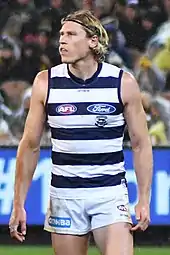 Geelong used 40 players from their playing list this season, with six playing in all 23 of the club's games.[30] There was seven players who played in their first AFL game: Ryan Abbott, Lachie Fogarty, Jack Henry, Jamaine Jones, Tim Kelly, Quinton Narkle and Esava Ratugolea.[31] Stewart Crameri also played his first game for the Cats, having previously played for both Essendon and Western Bulldogs.[32] Tom Hawkins was the club's leading goalkicker for the seventh successive season, scoring 60 goals;[33] Hawkins also finished in third position overall for the Coleman Medal, awarded to the league's highest individual goal-scorer during the regular season.[34]