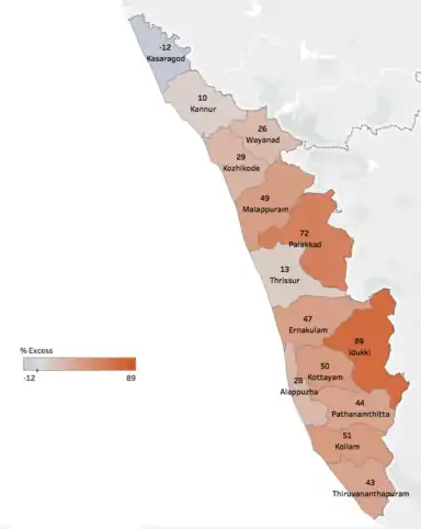 Kerala received heavy monsoon rainfall, which was about 116% more than the usual rain fall in Kerala, on the mid-evening of 8 August, resulting in dams filling to their maximum capacities; in the first 48 hours of rainfall the state received 310 mm (12 in) of rain.[22] Almost all dams had been opened since the water level had risen close to overflow level due to heavy rainfall, flooding local low-lying areas.[23][24] For the first time in the state's history, 35[16] of its 54[17] dams had been opened. The deluge has been considered an impact of the global warming.[25][26] [27]