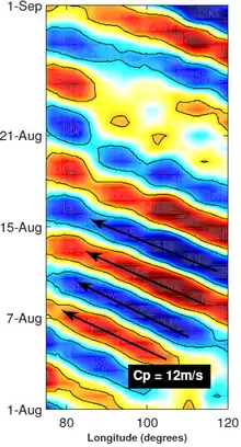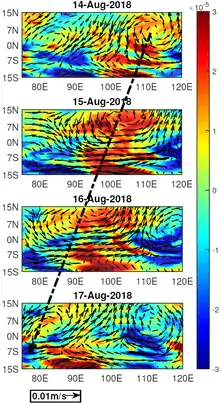Independent scientific studies conducted by Hydrology experts from IIT Madras, Purdue University, and IIT Gandhinagar concluded that it was the heavy downpour that resulted it the floods, and not the dam management.[28][29][26][30] Based on a computer-simulation of flood storage and flow patterns by a team of researchers from IIT Madras and Purdue University, it was found that the devastation wrought by the floods cannot be attributed to the release of water from dams. Further, the scientists added that the odds of such floods were "0.06%" and no reservoir management could have considered such scenarios.[29] Hydrology expert from IIT Gandhinagar, Prof. Vimal Mishra, identified four major factors for the floods. Unexpected above normal downpour, extreme rainfall events occurring almost across Kerala during the season, over 90% reservoir storage even before the onset of extreme rainfall events, and finally, the unprecedented extreme rainfall in the catchment areas of major reservoirs in the State led to the disaster.[30] The prime reason for the anomalous rainfall in 2018 is the High-Frequency Mixed Rossby-Gravity Waves in the Mid-Troposphere triggered by the synoptic disturbances of the tropical Pacific.[31][32] These high-frequency waves manifested as cyclonic and anticyclonic circulations and dilated the wind field to establish zones of convection in the tropics, as they propagated across the Indian Ocean basin. Although the Madden-Julian Oscillation phase with 20–40 days period has favored convection in the tropics, the high-frequency mode correlates better with the anomalous precipitation during the intervals of extreme events.[33][34]