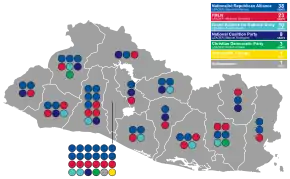 | Department | ARENA | FMLN | GANA | PCN | PDC | FPS | CD | PSD | Ind | |||||||||||||||