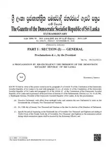Amid calls to reconvene parliament Sirisena and his party admitted they did not have enough votes to support Mahinda Rajapaksa against Ranil Wickremesinghe to decide the office of Prime Minister. Ahead of the president's announcement the UPFA said they were at least eight legislators short of getting a majority for Rajapaksa in the parliament. "At the moment we have 104 or 105 MPs," UPFA's spokesman Keheliya Rambukwella told reporters. He further went on to say the Sirisena-Rajapakse group hoped to secure support from "crossover" legislators. This is in contrast to what Sirisena claimed on the 5th, that he had the support of 113 legislators when he sacked Wickremesinghe. According to an AFP count, 120 MPs support Wickremesinghe and his allies.[77] President Sirisena dissolves Parliament by proclamation, from midnight of 9 November and declared snap elections to be held on around 5 January 2019.[78][56][79] The move was swiftly denounced by the United National Party in a post on Twitter, saying it "vehemently rejects" the sacking of the parliament. The party also accused Sirisena of robbing the "people of their rights and democracy".[78] The act was in violation of the 19th Amendment to the constitution, which he co-sponsored.[56][80] A short while later it was announced through an extraordinary gazette notice that general elections will be held on 5 January 2019, with the first meeting of the new Parliament to be held on 17 January 2019. UPFA MP Lakshman Yapa Abeywardena said "The nominations would be tendered from 9 to 26 November".[81] The JVP has accused Sirisena of trying to consolidate his power grab.[77] The election date was announced even before preparing the government's annual budget for the next fiscal year in 2019.[82]