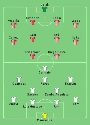 In the 21st minute, André-Frank Zambo Anguissa miss-controlled a pass out from goalkeeper Steve Mandanda, the ball came to Gabi who passed into Antoine Griezmann who scored with a low shot into the bottom left corner. Marseille captain Dimitri Payet left the match due to injury in the 32nd minute. It was 2–0 in the 49th minute when Antoine Griezmann dinked the ball past the advancing Steve Mandanda and into the bottom left from inside the penalty area after a pass from Koke.[14] Gabi got the third goal in the 89th minute with a low right foot finish from the right after another pass from Koke.[15]
