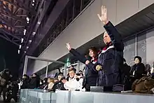 On 9 February 2018, Kim Yo-jong—sister of Kim Jong-un—attended the ceremony in Pyeongchang, South Korea. This was a first time that a member of the ruling Kim dynasty had visited South Korea since the Korean War.[56] Kim Yo-jong shook hands with South Korean president Moon Jae-in before sitting down to watch the ceremony together.[18]