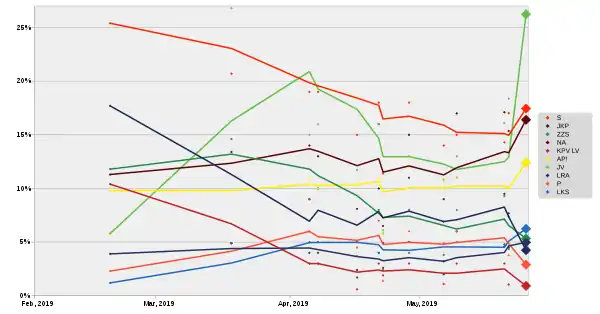 | 11–16 Apr 2019[3] | SKDS/Latvijas Televīzija | 912 | 11.7% (2) | 8.1% (1) | 15.0% (2) | 3.7% | 5.0% (1) | 0.6% | 2.4% | 10.6% (2) | 1.7% | 4.5% | 1% | 19.2% | 16.3% | 3.3% |