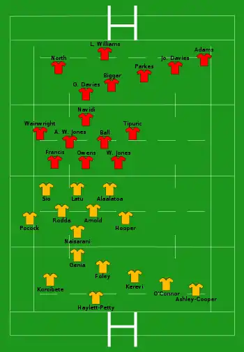 | Try: Smith 17' c Adams 49' c Penalty try 66' T. Williams 74' c G. Davies 80+5' c Con: Halfpenny (4/4) 18', 50', 75', 80+6' |