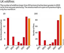 2019 United Kingdom wildfires were a series of wildfires that began on 26 February 2019 and ended on 18 May 2019.[2] The series of wildfires was considered unusual due to the fact that they took place early in the year. Areas affected by the wildfires in 2019 included those that had already been burnt by wildfires during the summer of 2018. The fires have created many air pollution problems for the UK.[3] The causes of most of the fires have been attributed to much higher than average temperatures and drought conditions that have prevailed since the spring of 2018.[4][5] There were 137 wildfires larger than 25 hectares (250,000 m2) recorded in the United Kingdom in 2019.[6] This beats the previous record of 79 from 2018.[7]