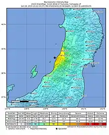 The 2019 Yamagata earthquake (山形県沖地震, Yamagata-ken Oki Jishin)[1] was an earthquake of magnitude 6.4 Mw which struck primarily the Hokuriku region in Japan on 18 June 2019 at 22:22 JST (13:22 UTC). The epicenter was close to the city of Tsuruoka, Yamagata.[4][5][2][3] A tsunami warning was also issued.[2][3]
