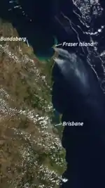 A large bushfire was started on 14 October 2020 by an illegal campfire within the Duling Camp Zone of Eastern Beach on Fraser Island.[17] It impacted multiple communities and caused people to flee their homes as it burned out of control.[18]