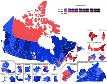 The election was originally scheduled for 27 June 2020, but on March 26, the party suspended the race due to the ongoing coronavirus pandemic crisis in Canada.[7] Party officials said they would revisit their decision on May 1.[7] On April 29, it was announced that the race would proceed by postal ballot with the election itself being rescheduled from June to August. To be counted, ballots needed to be completed and received by 21 August 2020 at 5:00 p.m. EDT.[8][4] The leadership election results were expected to be announced on 23 August,[9] but the first round results were not announced until the early morning on 24 August, due to machine malfunctions causing significant delays. MacKay led the first ballot with 33.52 per cent by a narrow margin of around 2 per cent. O'Toole subsequently led on the second ballot and won on the third ballot, becoming the new leader of the Conservative Party.