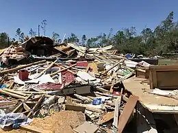 The tornado was estimated by the NWS to have been 2.25 mi (3.62 km) wide, making it the widest tornado in Mississippi state history, and the third-widest on record in the United States, surpassing the May 4, 2007, EF3 tornado associated with the Greensburg tornado family and just behind the 2004 Hallam tornado and the 2013 El Reno tornado. A total of eight fatalities and at least 95 injuries occurred along the path.[53][54] The tornado was also long-tracked, with a path length of 68 miles. Damage was severe to the point the path of the tornado could be seen from satellite imagery.[55] The tornado was given a high-end EF4 rating with estimated winds of 190 mph (310 km/h).[26] Debris from the tornado was carried considerable distances, with a photo from a destroyed home in Moss being found 121 miles away in Tuscaloosa, Alabama, while another one was lofted and carried 176 miles from south of Collins, Mississippi to Randolph, Alabama.[56][57] The path of the tornado also mirrored that of a long-tracked F3 tornado that killed two and injured 19 on April 21, 1951.[58][59]