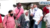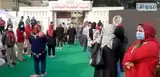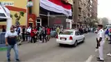 Egyptian voters lining up according to social distancing procedures in front of a polling station