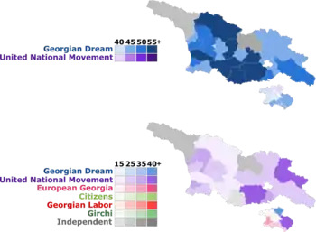 Four exit polls showed ruling Georgian Dream leading in the elections. An exit poll conducted by Imedi TV showed Georgian Dream leading with 55% of votes, while according to polls conducted by Rustavi 2 showed GD securing 52.26% of votes cast. Mtavari Arkhi and Formula TV consecutively showed the party winning 41% and 46% of votes. Shortly after, Georgian Dream declared victory.[22] However, the opposition refused to concede defeat and claimed that they had secured enough votes to form a coalition government. UNM leader David Kirtadze said, "This is not a real picture."