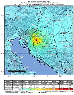 At approximately 12:20 PM CET (11:20 UTC) on 29 December 2020, an earthquake of magnitude 6.4 Mw (6.2 ML) hit central Croatia, with an epicenter located roughly 3 km (1.9 mi) west-southwest of Petrinja.[1] The maximum felt intensity was estimated at VIII (Heavily damaging) to IX (Destructive) on the European macroseismic scale.[2] Before this event there were three foreshocks, the strongest of which had a magnitude of 5.2 Mw on the day before. The earthquake was followed by numerous aftershocks, the strongest of which had a magnitude of 4.9 Mw. The adversely affected areas were mostly in the Sisak-Moslavina County and other nearby Croatian counties, as well as some of the nearby areas of Bosnia and Slovenia.
