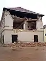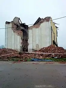 In Petrinja, the town closest to the epicenter, almost all houses were damaged.[40] The whole town centre was heavily damaged.[41] One elementary school was damaged.[42] Roofs of the town hall and the Church of Saint Lawrence were destroyed.[43] The entire village of Brest Pokupski near Petrinja was heavily damaged.[41]