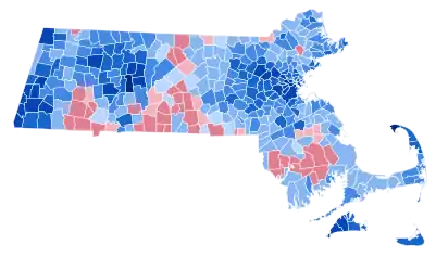 Massachusetts had been a Democratic-leaning state since 1928, and a Democratic stronghold since 1960, and has maintained extremely large Democratic margins since 1996, and this remained true in 2020, with Massachusetts being one of six states (along with Hawaii, Vermont, Maryland, California, and New York) that gave Biden over 60% of the vote. Massachusetts is ethnically diverse, highly urbanized, highly educated, and among the least religious states. Per exit polls by the Associated Press, Biden's strength in Massachusetts came from college-educated voters, which he won with 74% of the vote, which carries particular weight in Massachusetts, as the state contains the highest proportion of graduates in the country.[5] Trump's slip among suburban white voters led Biden to carry almost every municipality in the Greater Boston area by at least 60% or more, while Trump carried only several towns on the South Shore and in Central Massachusetts. Biden won 301 of the 351 municipalities.[6] Biden swept all demographic groups, garnering 63% of whites, 84% of Latinos, 58% of Catholics, 56% of Protestants, and 86% of Jewish voters. Additionally, Biden won 52% of whites without a college degree within the state.[5] As in other places around the country, Trump did improve on his 2016 performance in heavily Hispanic cities such as Lawrence, Chelsea, and Holyoke.[7] Trump had the worst vote share in Massachusetts of any Republican nominee since 1996, and slightly underperformed George W. Bush's 32.5% vote share in 2000.