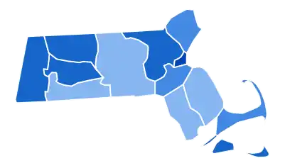 Biden easily carried Massachusetts with a 33-point margin, the largest margin whereby any nominee had carried the state since 1964. Massachusetts was one of three states where Biden won every county, the other two being Rhode Island and Hawaii. It was the eighth election in a row that the Democratic candidate carried every single county in the state. It is also the highest percentage of the popular vote that a winning presidential candidate has received in the state since Lyndon B. Johnson won the state with over 70% of the vote back in 1964. It is also the second time that a presidential candidate has won Suffolk County with over 80% of the vote in presidential history after Lyndon B. Johnson won the county with over 80% of the vote back in 1964, and the first time that a presidential candidate has won Middlesex County with over 70% of the vote since 1964.[4] In addition, Biden won the following counties with the highest percentage of the popular vote that was seen for a Democratic presidential candidate in history: Barnstable County, Dukes County, and Nantucket County. Biden won nearly 2.4 million votes, the most received by a Democrat in a presidential election in the state's history.