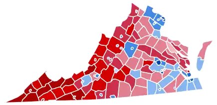 Prior to the election, most news organizations considered this a state Biden would win, or a likely blue state. On the day of the election, Biden won Virginia with 54.11% of the vote, and by a margin of 10.11%, the best performance for a Democratic presidential candidate since Franklin D. Roosevelt in 1944.[3] Biden became the first Democratic nominee to win Chesterfield County and Lynchburg City since 1948, Virginia Beach City since 1964, James City County since 1968, and Stafford County since 1976.[4] He also flipped Chesapeake City back to the Democratic Party. Trump flipped no counties or independent cities in the state. Nevertheless, Biden became the first Democrat in history to win the election without Covington City, Nelson and Caroline County, as well as the first since 1992 to win without Buckingham County, and the first since 1960 to win without Westmoreland County, a notable bellwether.