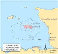 In 1839 the first treaty on fishing in waters between Jersey and France was made, limited to regulating oyster farming.[17] Slight amendments were made in 1920[18] and again in 1951 when the words 'oyster fishing' were omitted to widen the scope of the agreement, effectively giving French fishermen the right to fish up to three miles off Jersey's coast without restrictions or controls.[17] By 1981 the growth in fishing and reducing stocks meant it was inadequate for modern fishing practices.[17] From 1992 until 2000,[19] Jersey Senator Pierre Horsfall negotiated a new agreement with his French counterparts. The Agreement Between The United Kingdom of Great Britain and Northern Ireland and The French Republic Concerning Fishing In The Bay of Granville was signed on 4 July 2000 by Michael Wilkes, Lieutenant Governor of Jersey on behalf of the Crown and Daniel Bernard, French ambassador on behalf of France,[20] but its implementation would require changes to the legislation in both Jersey and France.[18] It came into force on 1 January 2004, giving Jersey and France shared responsibility for the management of fishing in the area between 3 and 12 nautical miles (3.5 and 13.8 mi; 5.6 and 22.2 km) off Jersey’s coast under terms of the agreement. As of February 2020, 392 French boats had active permits to fish under the terms of the agreement, 67 of which actively use Jersey's waters to fish.[16][21]