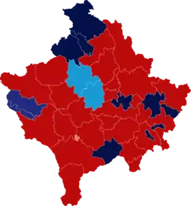 The 120 members of the Assembly of Kosovo are elected by open list proportional representation, with 20 seats reserved for national minorities.[2] An electoral threshold of 5% is in place for non-minority parties. Seats are allocated using the Webster/Sainte-Laguë method.[3] To form a government, a party or coalition must have a majority of 61 MPs out of 120 seats in the Assembly of Kosovo.