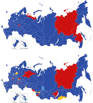 The 2020 constitutional referendum was held from 25 June to 1 July; 78% of Russian voters approved on the new amendments including extension of Putin's term to 2036.[49] Despite the outcome, the referendum was criticized as being flawed with cases of electoral fraud.[50] Unsanctioned protests over the result of the vote occurred to with 140 people being detained in Moscow.[51] In spite of the rejection of the self-dissolution amendment, the legal possibility of holding a snap election remained in the case of a triple refusal of the State Duma to confirm the Prime Minister or Ministers, or a double vote of no confidence in the government. Immediately after the amendments to the constitution came into force, speculation about possible early elections resumed. In particular, Sergey Mironov, the leader of JR, assumed that early elections could be held, referring to the desire of the country's senior leadership.[52] According to analysts, a snap election could have been held in December 2020 or early 2021.[53]
