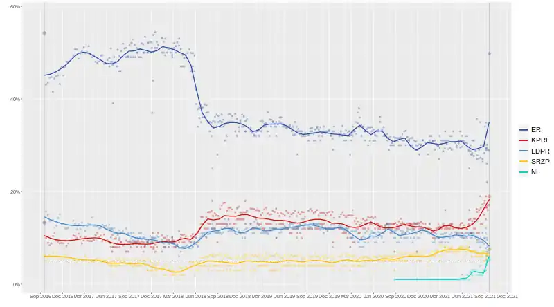 After the 2016 Russian legislative election, United Russia was the most popular party, with its polling rates ranging from 40% to 55%, while the ratings of the main opposition parties were much lower; the Communist Party of the Russian Federation (CPRF) and the Liberal Democratic Party of Russia (LDPR) each had just over 10%, while A Just Russia (JR) was around the 5% threshold required to enter the State Duma.