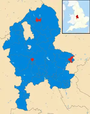 The result was a second consecutive landslide victory for the Conservative Party which increased its majority on the council from 51 seats in 2017 up to 57 seats, out of a possible 62. The Labour Party lost six of its ten seats which was the party's worst result since the 2009 election when it had been left with three seats; Labour was left without any representation in five of the county's eight districts and boroughs. The remaining seat was won by an independent candidate who held her Stone Urban seat.