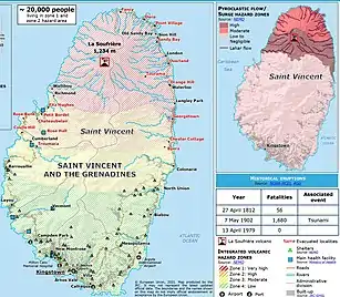 La Soufrière, a stratovolcano on the Caribbean island of Saint Vincent in Saint Vincent and the Grenadines, began an effusive eruption on 27 December 2020. On 9 April 2021 there was an explosive eruption, and the volcano "continued to erupt explosively" over the following days, with pyroclastic flows.[4] The activity pattern of the eruption was comparable to that of the event that occurred in 1902, which had a Volcanic Explosivity Index (VEI) of 4.[5][1] The volcano is known to have erupted 23 times in the last 4,000 years, and had been dormant since 1979.[1]