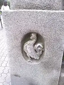 This corner building is characterised by its towering peak topped with a metal roof. At street level, the fence is adorned with animal figures (rooster, owl, fish).