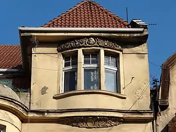 The large facade displays scattered rosettes. Its two massive avant-corps are topped by terraces. There are Art Nouveau mouldings beneath a balcony, as well as on gable top. The main entrance door boasts a web-shaped transom light.