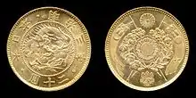 In November 1869, new units of yen were established in the form of a metric system. During this time it was decided that silver would become the standard unit of value leaving gold coinage as a subsidiary.[1] The Japanese government considered adopting the gold standard as early as December 1870 after hearing about its implementation in the United States.[1] This system was officially put into place on May 10, 1871 setting standards for the 20 yen coin.[1] Gold coinage eventually ground to a halt within a few years as coinage regulations that had been put into place were not sufficient to maintain a healthy growth of gold monometallism. This was in part due to the issuance of large amounts of in-convertible paper currency which drove gold coins out of the country.[2] Coinage of the 20 yen piece had all but stopped by 1877, and those struck in 1880 were only done so as part of presentation sets for visiting dignitaries and heads of state.[3]