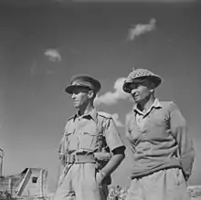 At Minqar Qaim, the division was to hold and delay the advance of the Panzer Army Africa for as long as it could while remaining intact.[62] By the middle of the afternoon of 27 June, the division had been encircled by the 21st Panzer Division. German tanks and infantry approached the 2nd New Zealand Division's positions, including the 20th Battalion's sector on the northern side of the Minqar Qaim escarpment, and were successfully beaten off. Upham, who had the received the VC for his actions at Maleme in Crete, was prominent during this time, directing the supporting anti-tank guns and deliberately drawing fire from German machine guns so that they could be targeted. The battalion's mortars were used to harry enemy infantry trying to clear the mines guarding its position.[63] Later in the day, the battalion's second-in-command, Major Ian Manson, took over leadership from Burrows, who had to take over as commander of 4th Brigade after its previous commander, Brigadier Lindsay Inglis, had taken over the division when Freyberg had been wounded.[64]