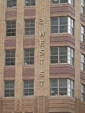 ![]() 21 West Street, with Downtown Athletic Club at right (partly obscured), May 2001 | |