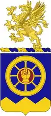 The 246th Transportation Battalion coat of arms and distinctive unit insignia were both approved on 17 April 2008.[2] Both consist of a blue shield with a gold wheel and gauntlet surmounting the brick red hub. The base of the shield consists of a golden yellow dancetté.